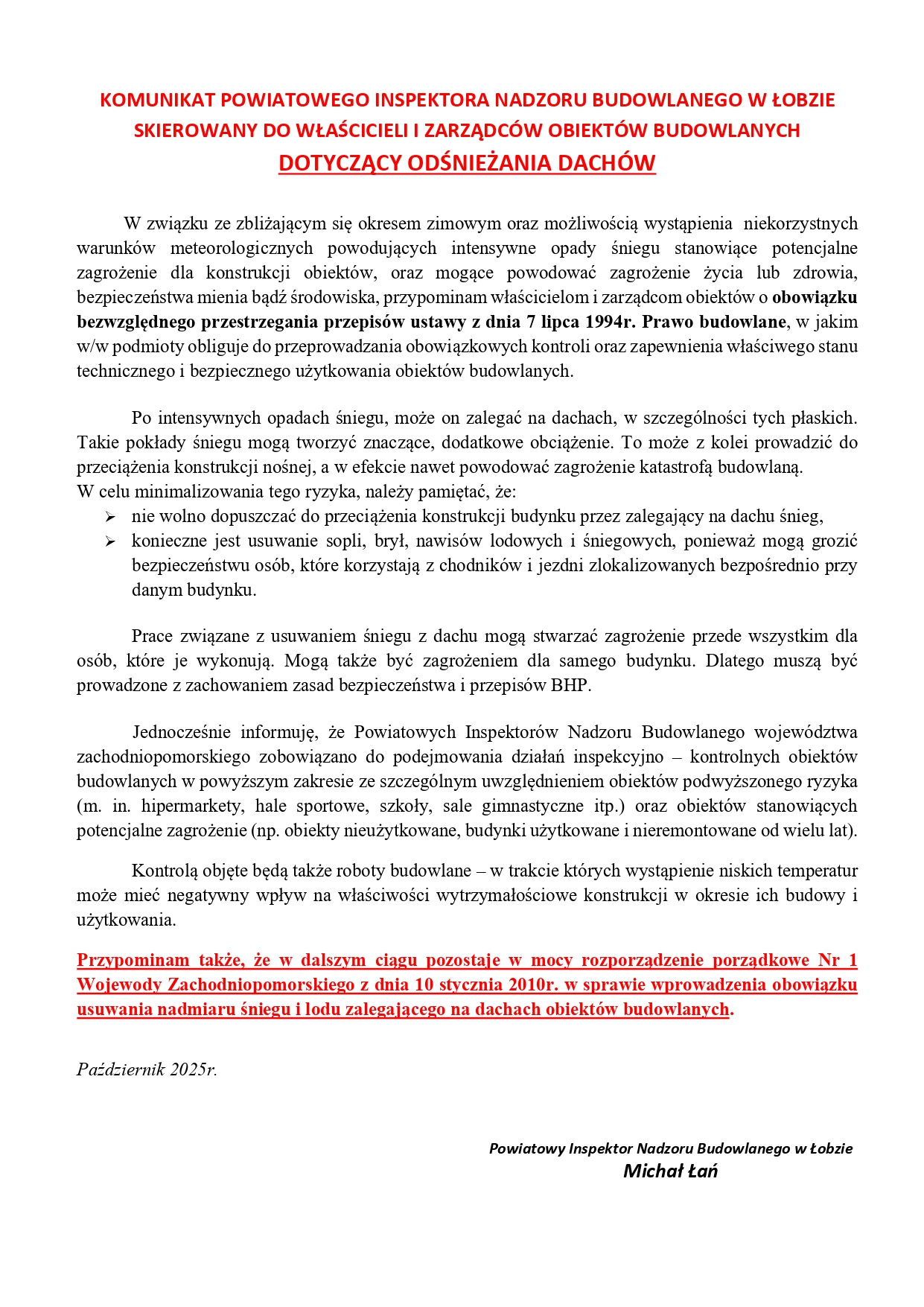Komunikat Powiatowego Inspektora Nadzoru Budowlanego w Łobzie