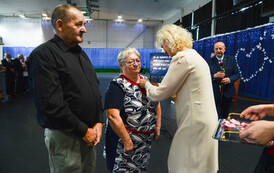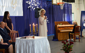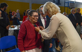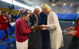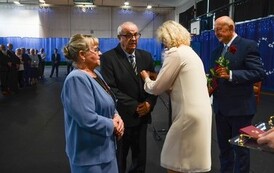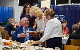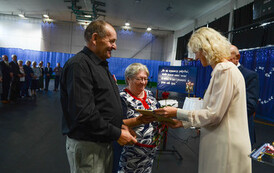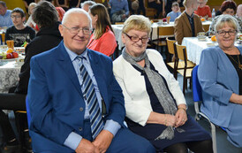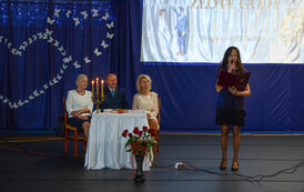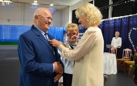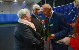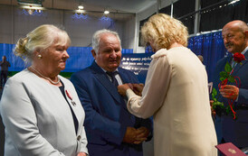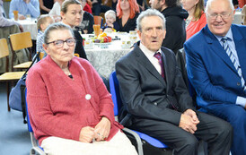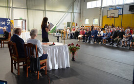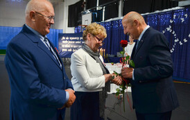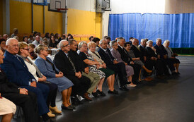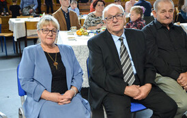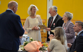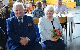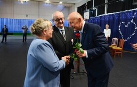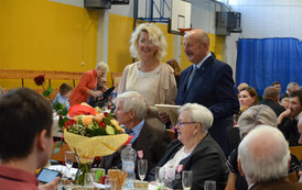 Następnie, w hali widowiskowo - sportowej w Węgorzynie, w obecności licznie przybyłych rodzin Jubilatów, w atmosferę Jubileuszu wprowadziła nas kierownik USC Pani Aleksandra Paraszczak, po której Pani Monika Kuźmińska – Burmistrz Węgorzyna, razem z Przewodniczącym Rady Miejskiej – Panem Janem Mazuro i Wiceprzewodniczącą Rady Powiatu w Łobzie - Panią Janiną Mazuro, złożyła Szanownym Jubilatom gratulacje oraz serdeczne życzenia. Burmistrz Węgorzyna udekorowała Złote Pary, przyznanymi przez Prezydenta Rzeczypospolitej Polskiej - Pana Andrzeja Dudę, medalami „Za Długoletnie Pożycie Małżeńskie”. Jubilaci otrzymali dyplomy, kwiaty, upominki oraz pamiątkowe zdjęcia. Odśpiewano również tradycyjne „Sto lat”, był też okolicznościowy tort.